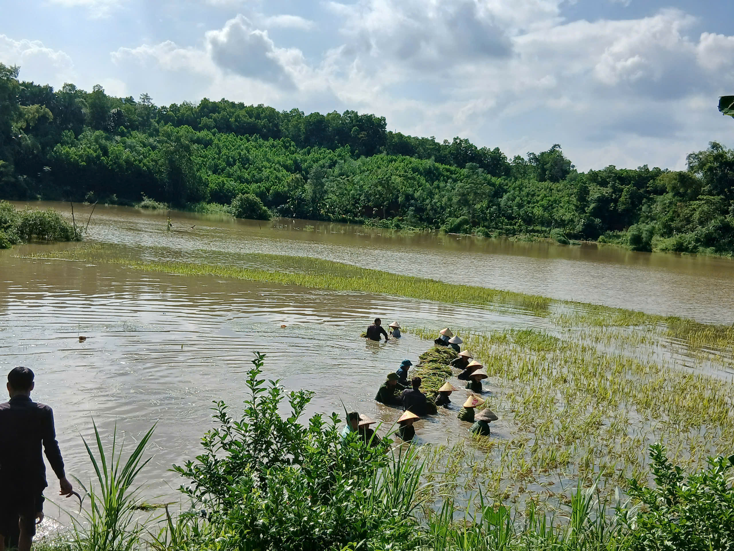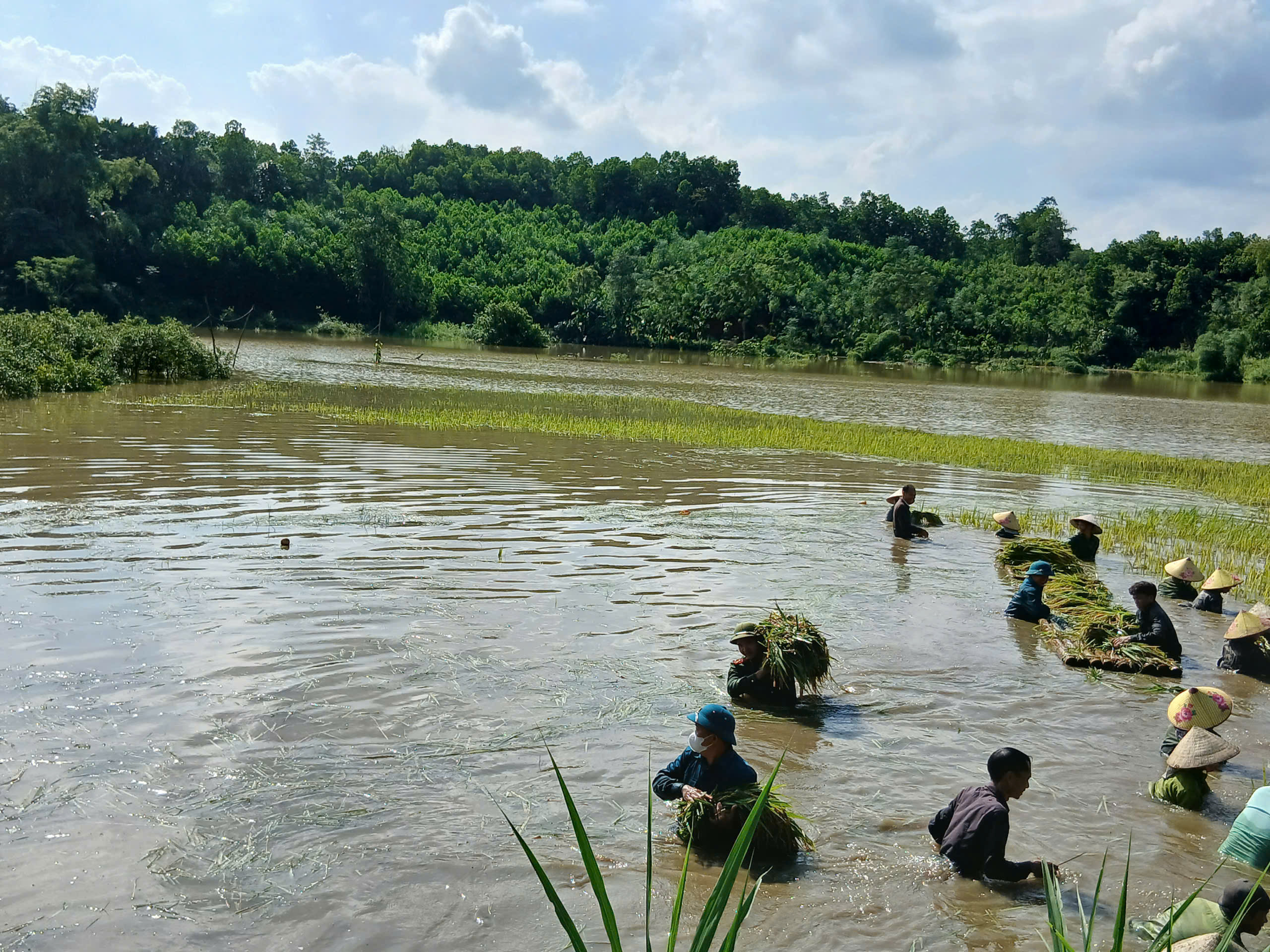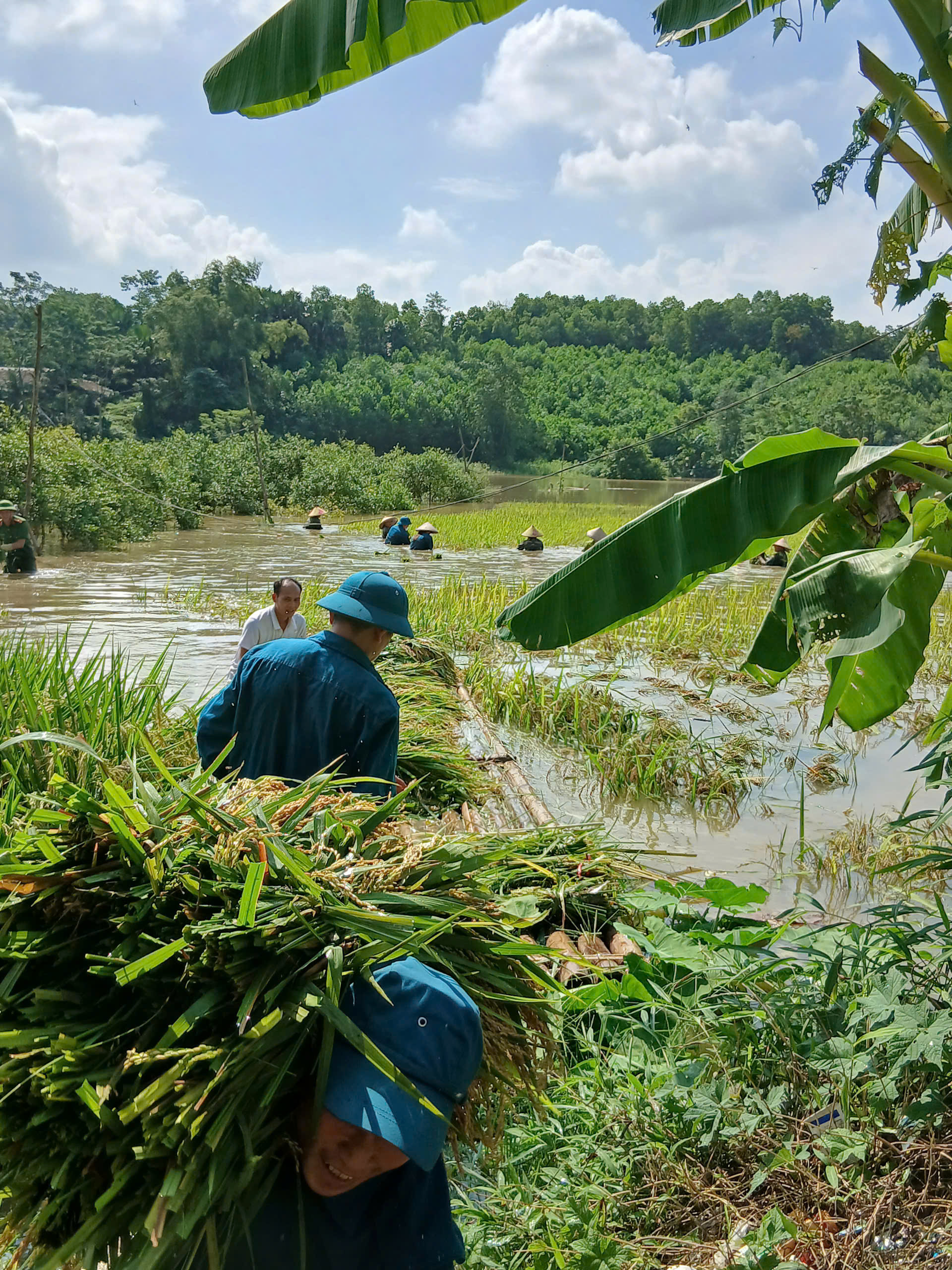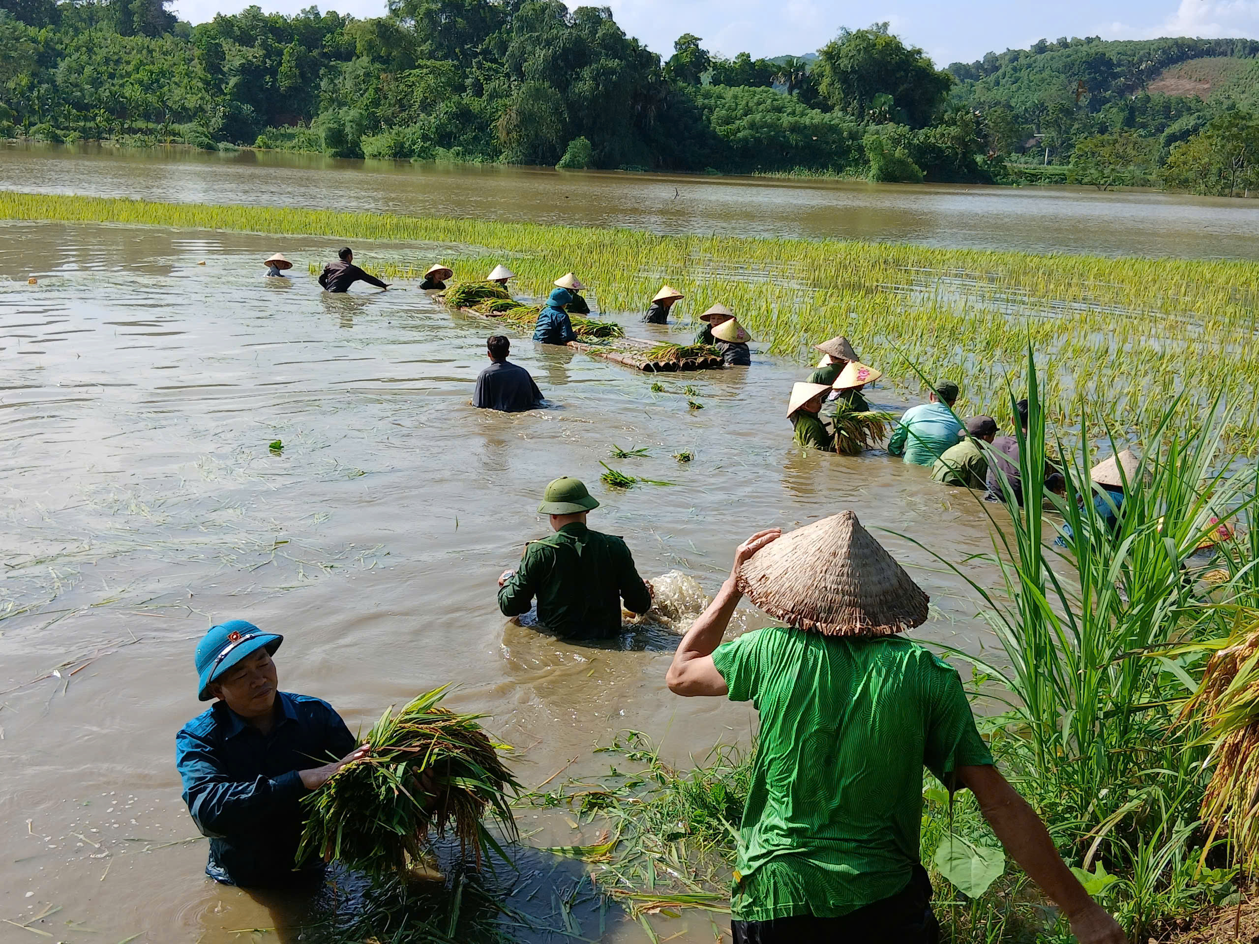 Dù phải làm việc trong điều kiện thời tiết không thuận lợi, đường ruộng trơn trượt, nhưng các chiến sĩ dân quân, đoàn viên thanh niên và cán bộ xã vẫn không quản ngại khó khăn, lội ruộng gặt lúa, vận chuyển lúa về nơi khô ráo, giúp bà con tránh được nguy cơ lúa bị ngấm nước, nảy mầm gây mất trắng. Hình ảnh các lực lượng “dầm mình trong nước, gặt lúa” đã để lại nhiều ấn tượng đẹp trong lòng nhân dân, thể hiện rõ tinh thần trách nhiệm, nghĩa tình quân – dân trong lúc hoạn nạn.