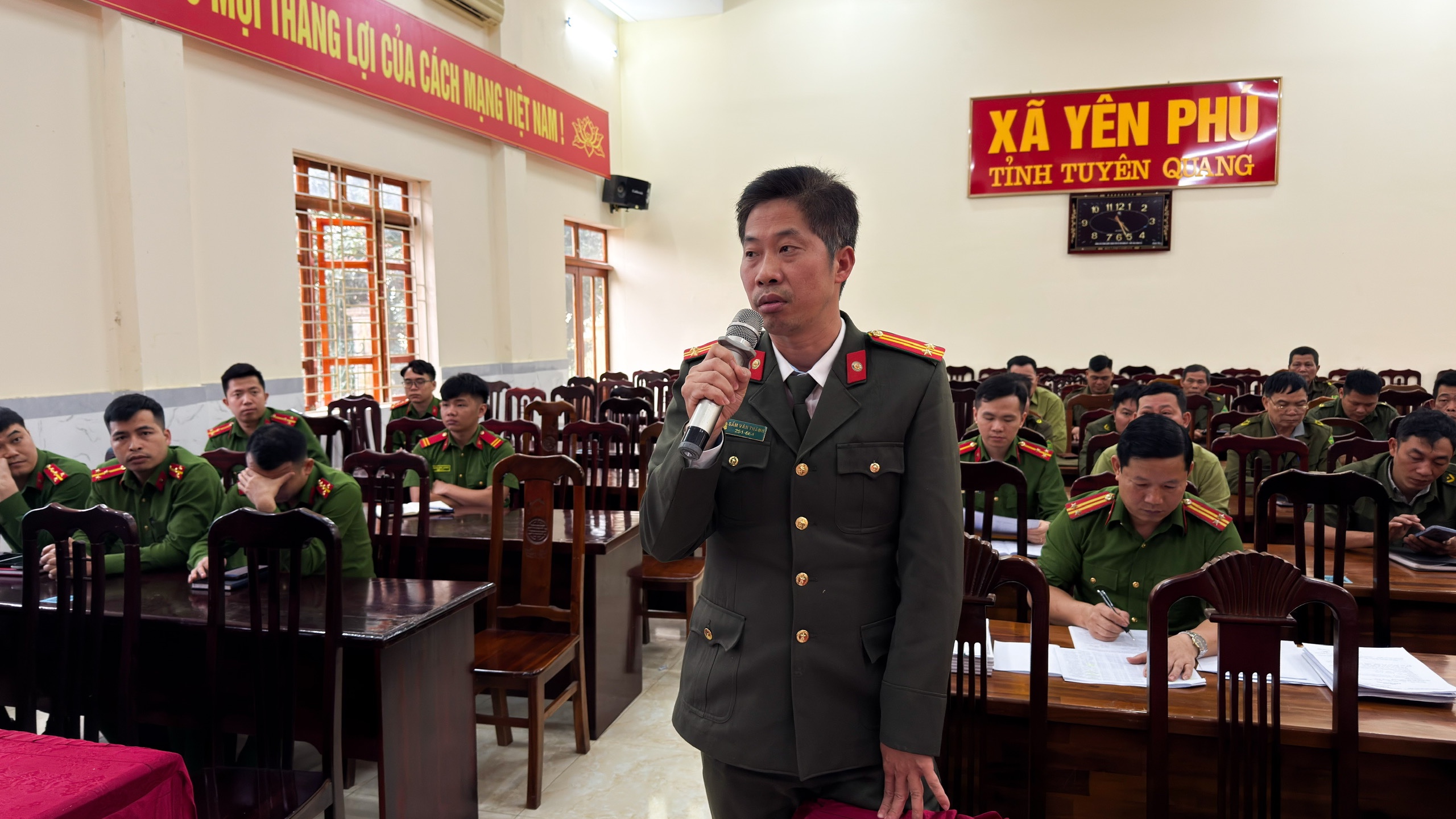 Đồng chí Đoàn Xuân Toàn, Trưởng Công an xã Yên Phú phát biểu tại hội nghị