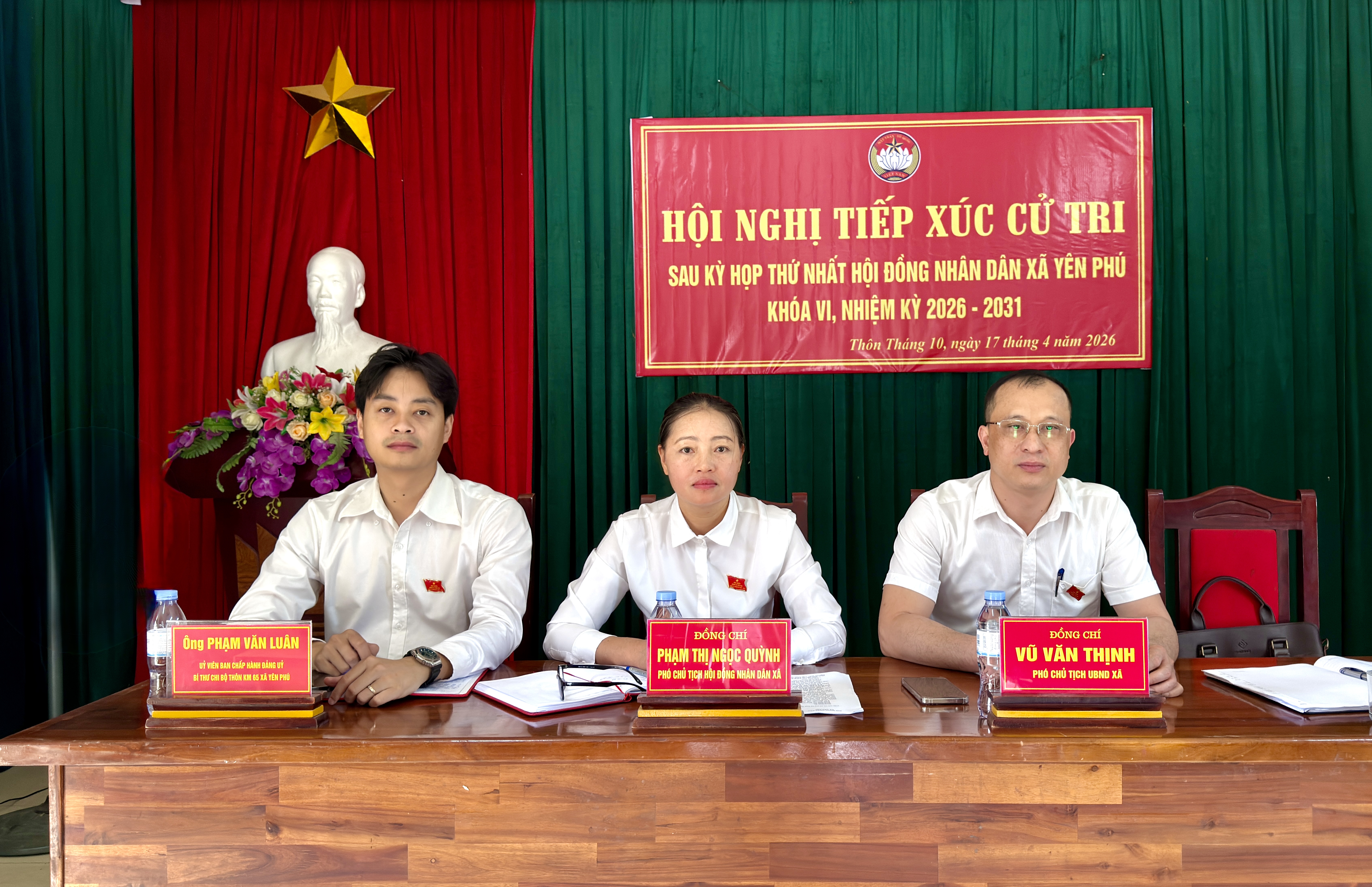 Hội nghị tiếp xúc cử tri sau kỳ họp thứ nhất Hội đồng nhân dân xã Yên Phú khóa VI, nhiệm kỳ 2026 - 2031 tại thôn Tháng 10, xã Yên Phú: Dự hội nghị có đồng chí Phạm Thị Ngọc Quỳnh, Phó Chủ tịch Hội đồng nhân dân xã; đồng chí Vũ Văn Thịnh, Phó Chủ tịch Ủy ban nhân dân xã, Giám đốc Trung tâm Phục vụ Hành chính công; đồng chí Phạm Văn Luân, Bí thư Chi bộ thôn Km65. Dự kiến tổ đại biểu sẽ có các buổi tiếp xúc cử tri tại các thôn Tháng 10, thôn Km 65, thôn Km 68 xã Yên Phú.