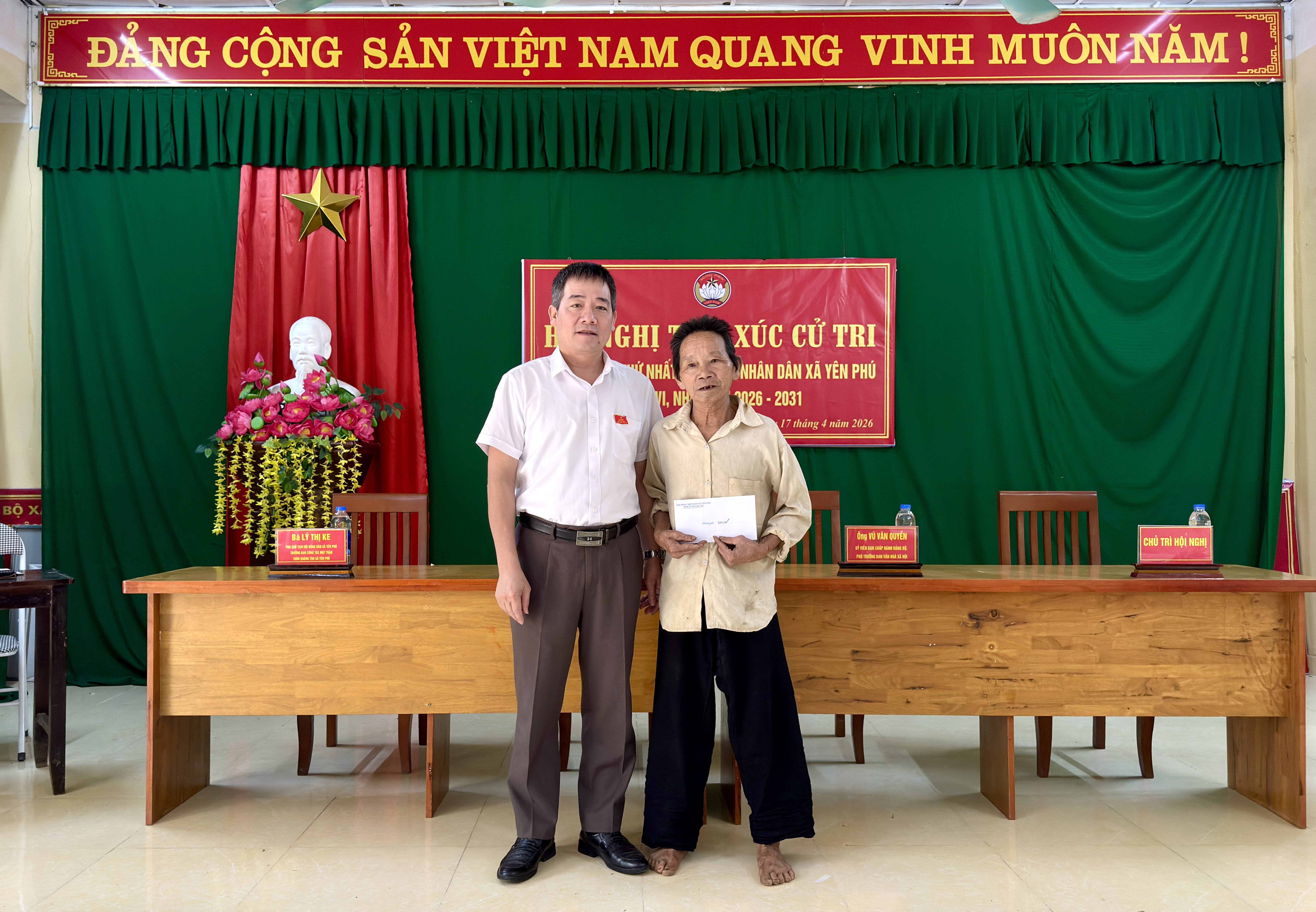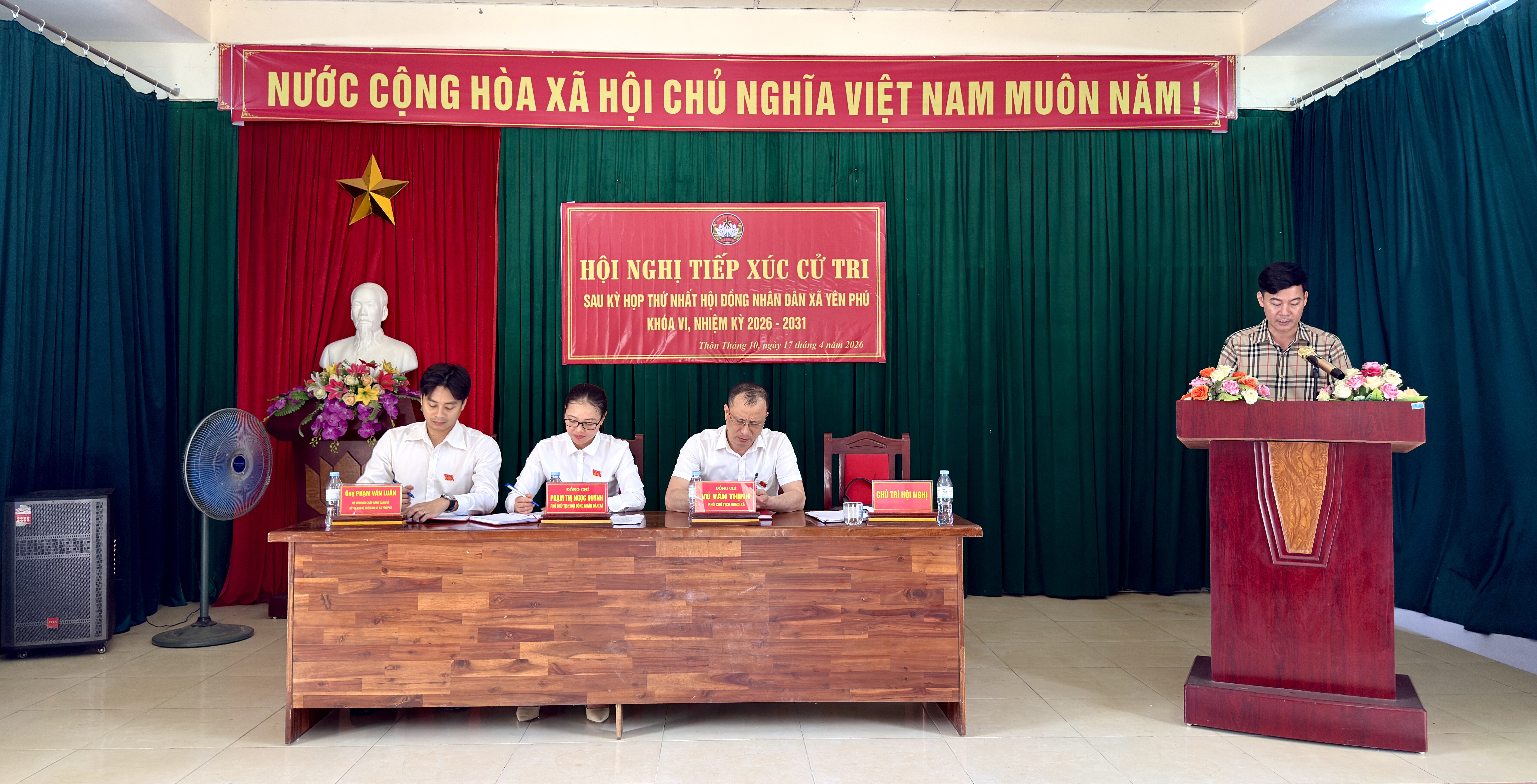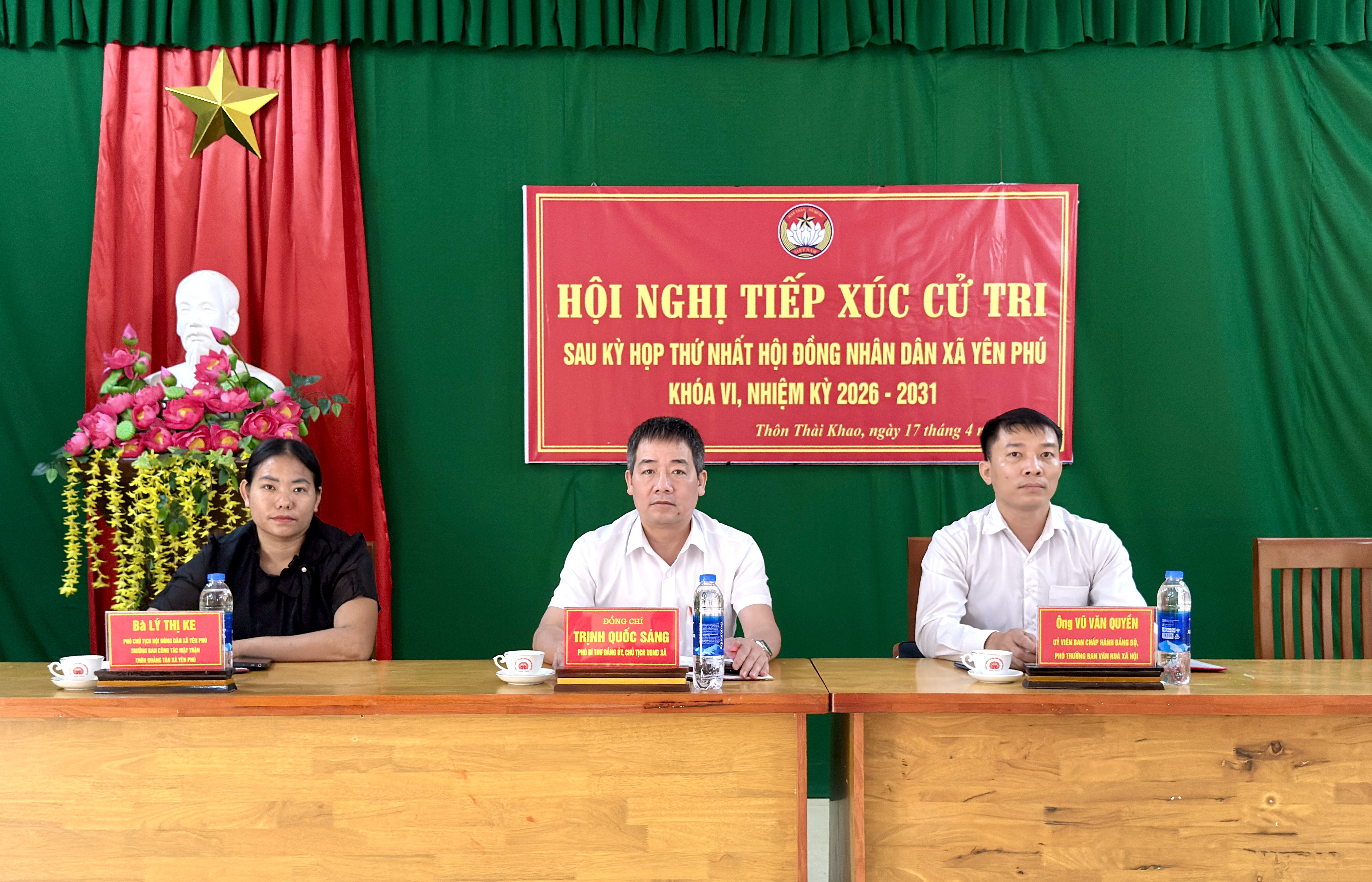 Hội nghị tiếp xúc cử tri sau kỳ họp thứ nhất Hội đồng nhân dân xã Yên Phú khóa VI, nhiệm kỳ 2026 - 2031 tại thôn Thài Khao, xã Yên Phú: Dự hội nghị có đồng chí Trịnh Quốc Sáng, Phó Bí thư Đảng ủy, Chủ tịch UBND xã; đồng chí Vũ Văn Quyền, Ủy viên Ban Chấp hành Đảng bộ xã, Phó Trưởng Ban văn hóa - xã hội xã; đồng chí Lý Thị Ke, Phó Chủ tịch hội Nông dân xã Yên Phú, Trưởng Ban công tác Mặt trận thôn Quảng Tân xã Yên Phú. Dự kiến tổ đại biểu sẽ có các buổi tiếp xúc cử tri tại các thôn Thài Khao, thôn Quảng Tân và thôn Ngòi Sen xã Yên Phú