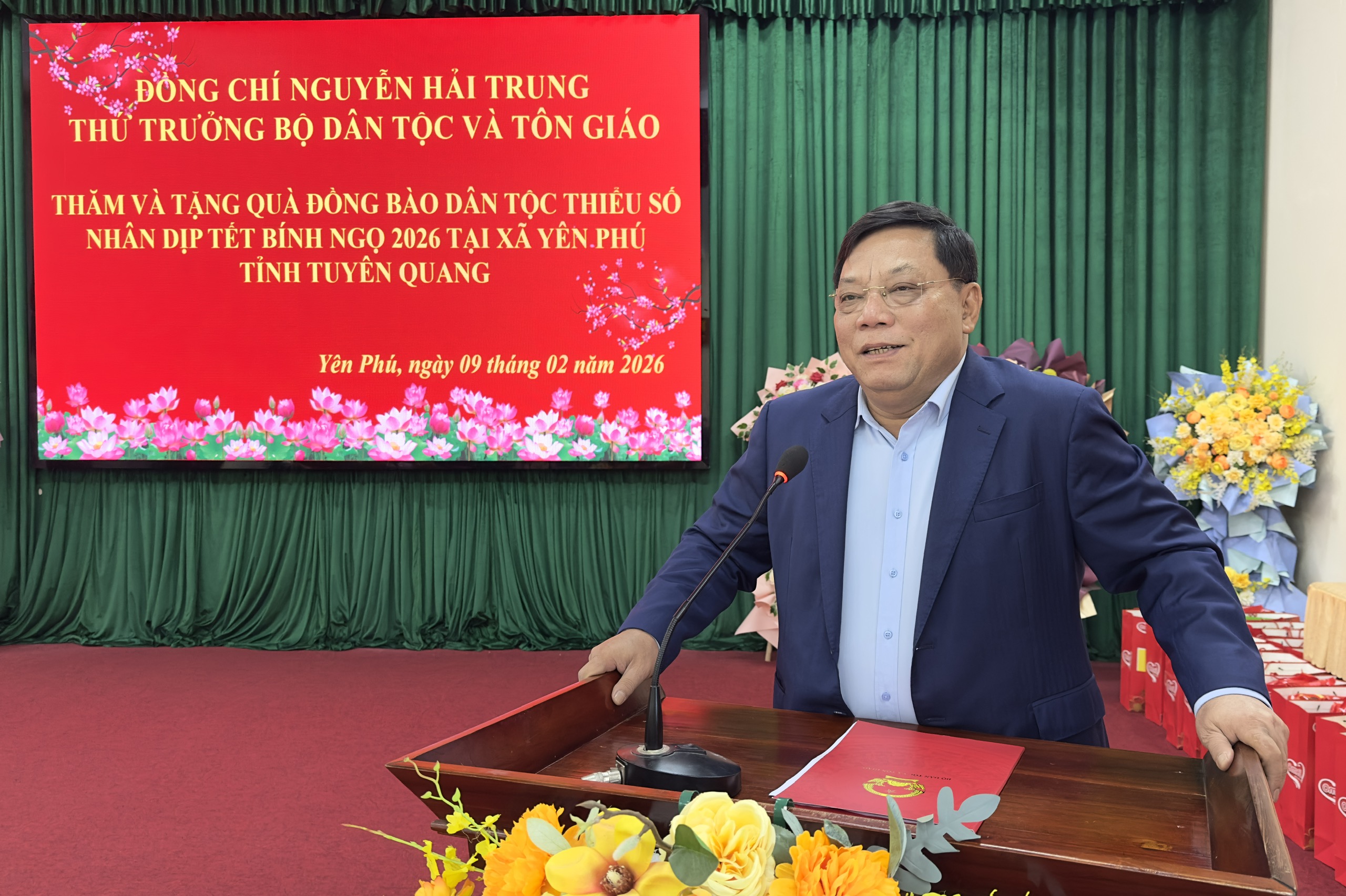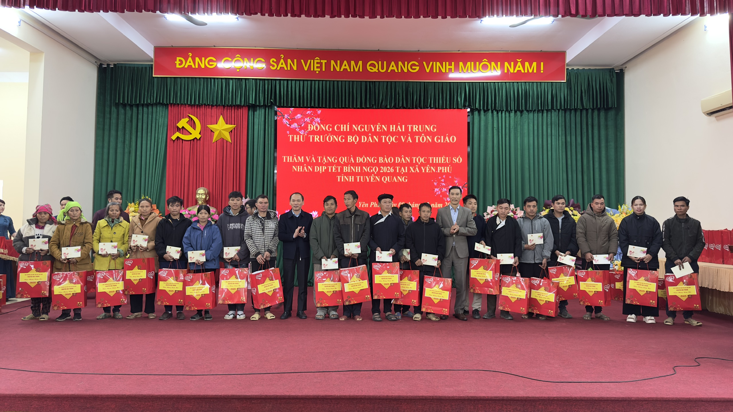 Phát biểu tại hội nghị, đồng chí Nguyễn Hải Trung, Thứ trưởng Bộ Dân tộc và Tôn giáo đã biểu dương, ghị nhận những thành tựu mà xã Yên Phú đã đạt được trong năm 2025. Đồng chí cũng vui mừng khi đến thăm hỏi, chúc Tết, tặng quà đồng bào dân tộc thiểu số, Người có uy tín trong cộng đồng và chức sắc, chức việc tại xã Yên Phú, tỉnh Tuyên Quang. Trong không khí ấm áp của những ngày giáp Tết, đồng chí Nguyễn Hải Trung đã trao tặng 137 suất quà Tết tới các hộ nghèo, đồng bào dân tộc thiểu số, Người có uy tín trong cộng đồng và chức sắc, chức việc tại xã Yên Phú. Những món quà không lớn, nhưng thể hiện tấm lòng, sự quan tâm, động viên, chia sẻ của Đảng và Nhà nước, của Bộ Dân tộc – Tôn giáo, của tỉnh tới đồng bào. Đồng chí mong muốn qua những phần quà này sẽ góp phần làm cho các gia đình sẽ đón Tết vui tươi, đầm ấm hơn, tăng thêm niềm tin và động lực để vươn lên trong cuộc sống. Đồng thời ghi nhận những đóng góp của đội ngũ Người có uy tín và chức sắc tôn giáo trong việc giữ gìn khối đại đoàn kết dân tộc, ổn định an ninh trật tự tại cơ sở.