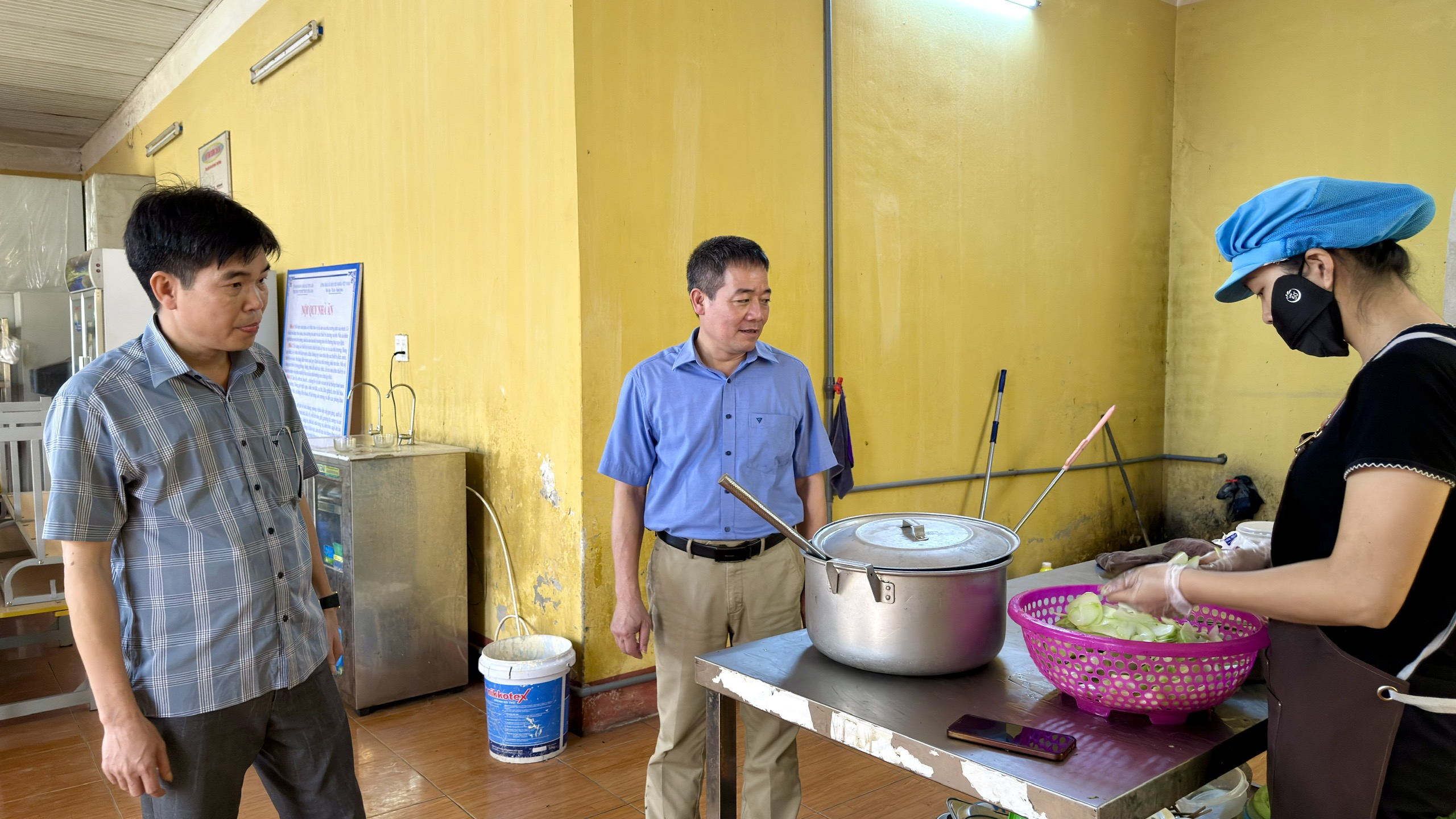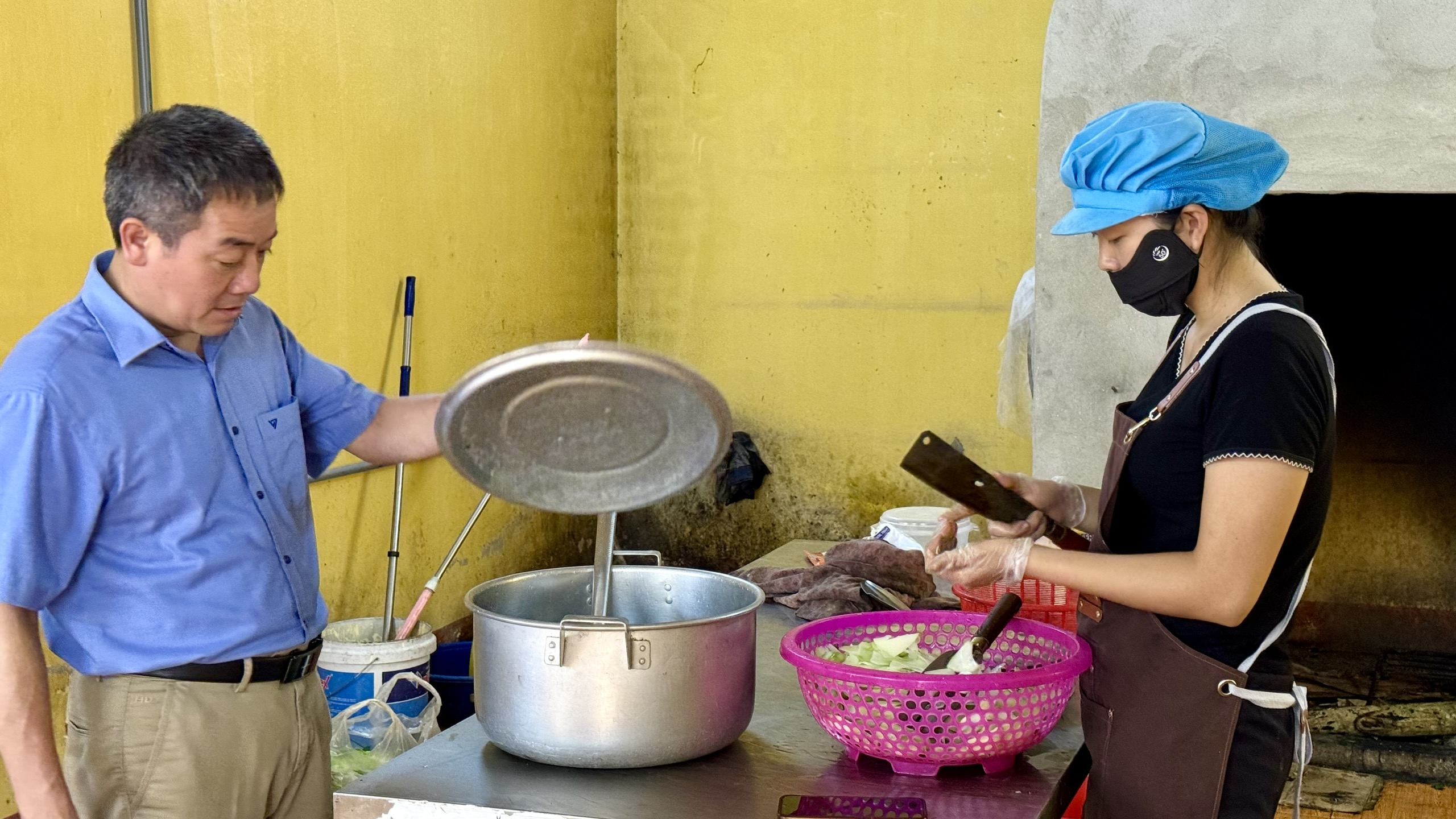Đồng chí Trịnh Quốc Sáng, Chủ tịch UBND xã đã kiểm tra khu vực bếp ăn, trực tiếp giám sát quy trình sơ chế, chế biến thực phẩm tại Trường Phổ thông Dân tộc bán trú Trung học cơ sở Yên Lâm