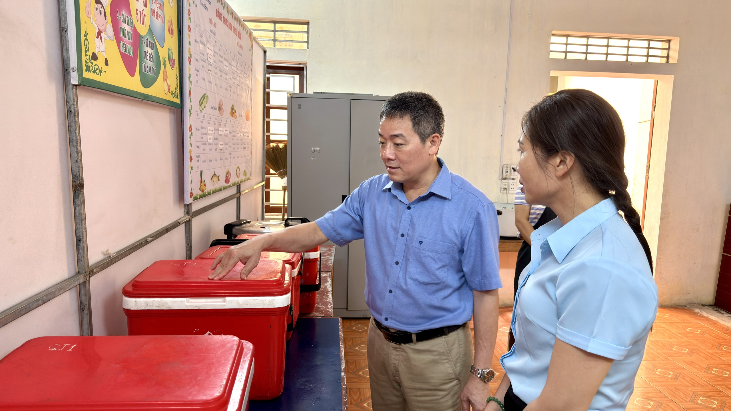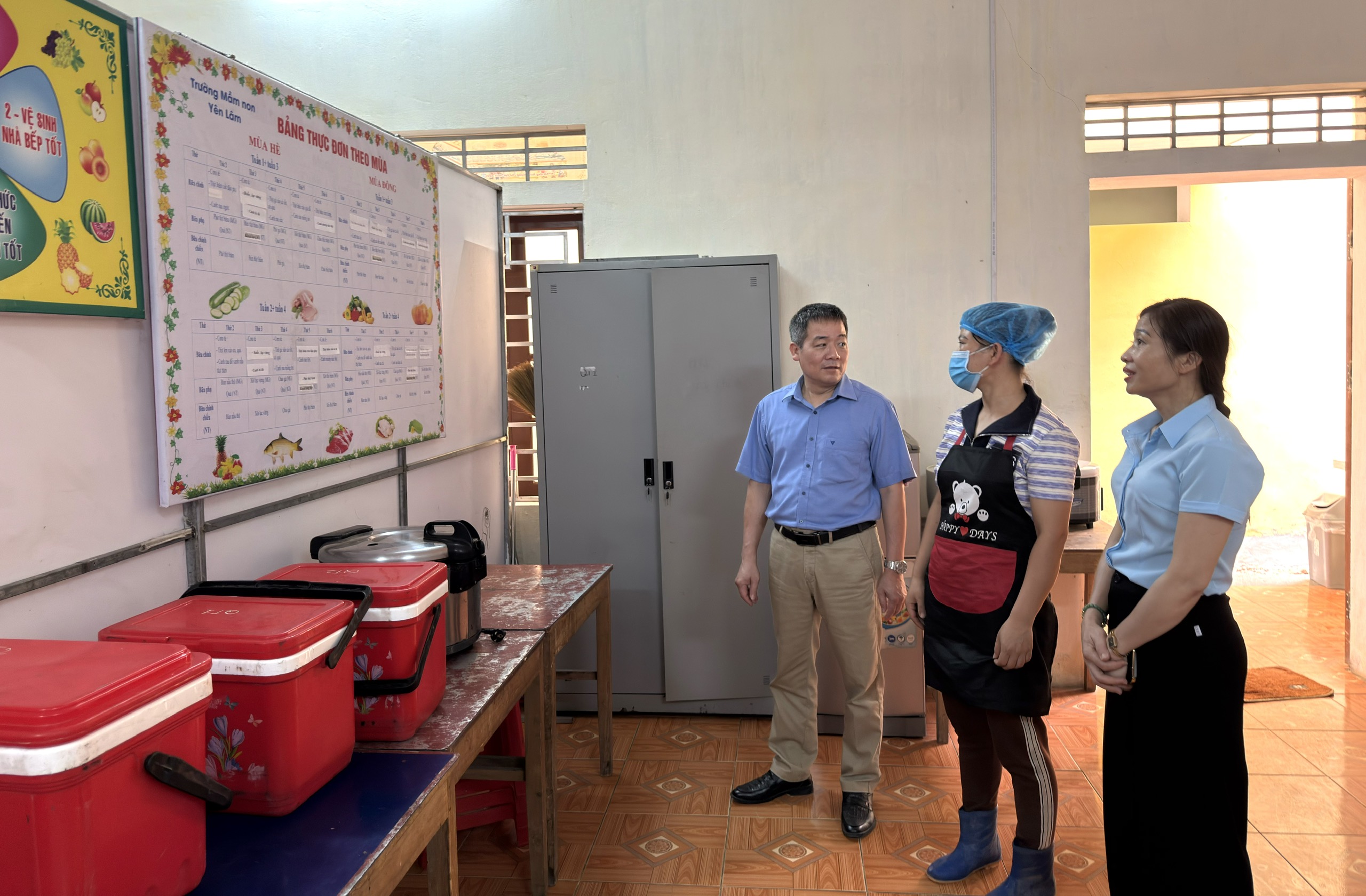 Đồng chí Trịnh Quốc Sáng trực tiếp kiểm tra công tác chuẩn bị bữa ăn cho các học sinh, đồng thời tuyên truyền về công tác đảm bảo an toàn phòng chống ngộ độc thực phẩm tại trường Mầm non Yên Lâm