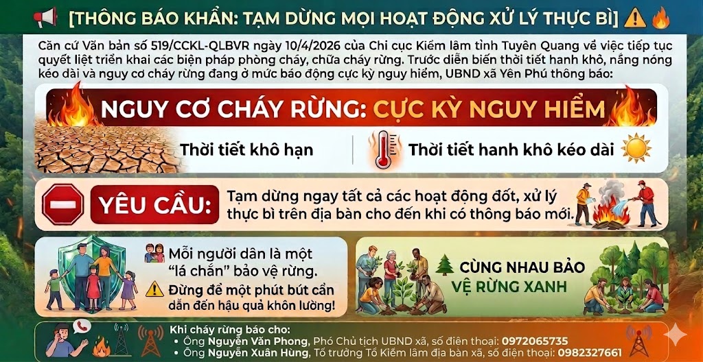 Thực hiện Văn bản số 2430/UBND-KTN ngày 09/4/2026 của UBND tỉnh Tuyên Quang, Văn bản số 2055/SNNMT-KL ngày 10/4/2026 của Sở Nông nghiệp và Môi trường và chỉ đạo của Chi cục Kiểm lâm tỉnh về việc tiếp tục quyết liệt triển khai các biện pháp phòng cháy, chữa cháy rừng. Đồng chí Trịnh Quốc Sáng, Chủ tịch Uỷ ban nhân dân xã đã nghe báo cáo của lực lượng kiểm lâm, công an xã và các thôn về tình hình quản lý, bảo vệ rừng, công tác tuyên truyền nâng cao ý thức người dân trong phòng chống cháy rừng. Qua kiểm tra cho thấy, các lực lượng chức năng và các thôn trên địa bàn đã chủ động triển khai nhiều biện pháp phòng ngừa như: tăng cường tuần tra, kiểm soát các khu vực có nguy cơ cao; tuyên truyền, vận động người dân không đốt nương rẫy, xử lý thực bì trong thời điểm nắng nóng; chuẩn bị đầy đủ dụng cụ chữa cháy tại chỗ theo phương châm “4 tại chỗ”.
