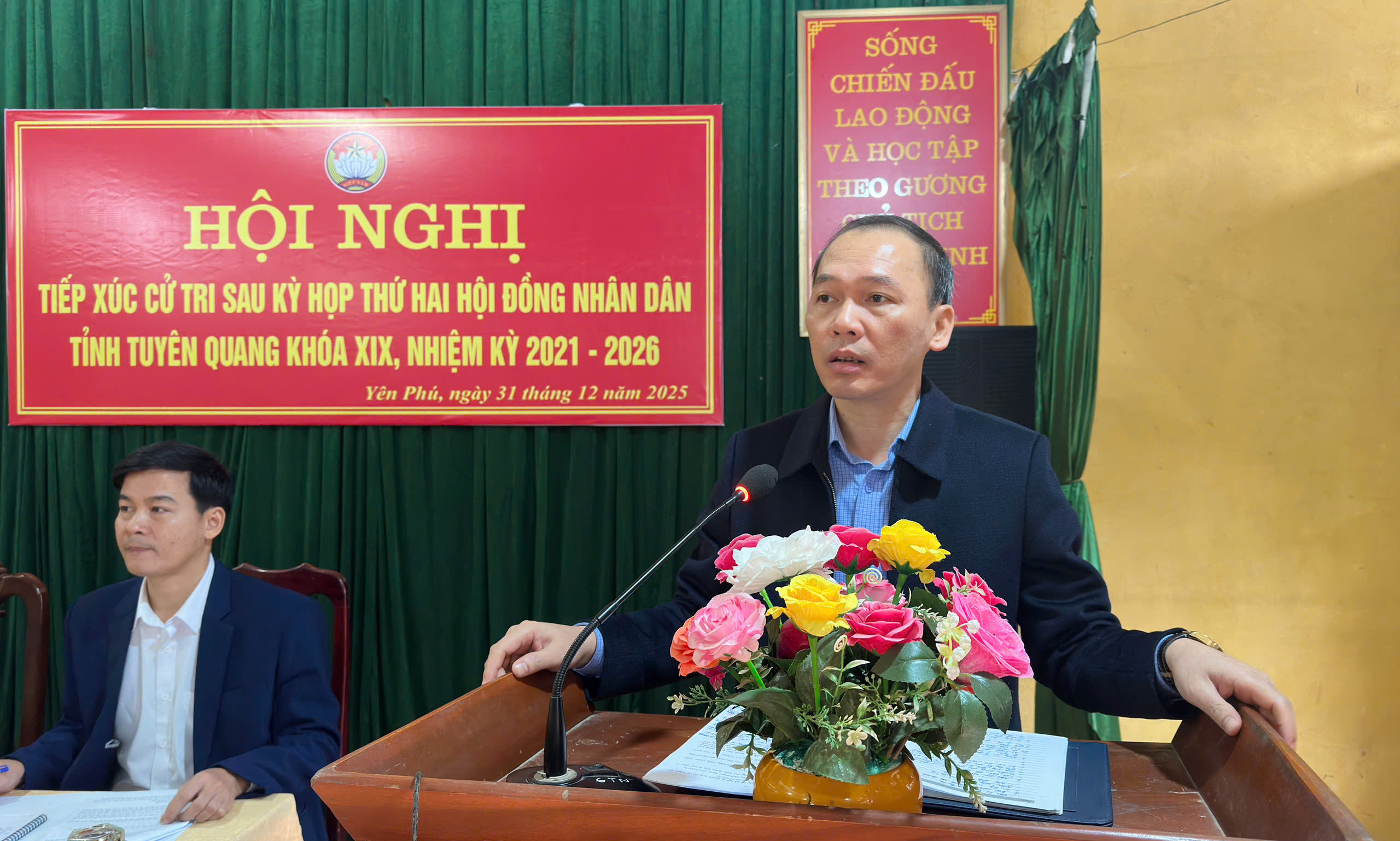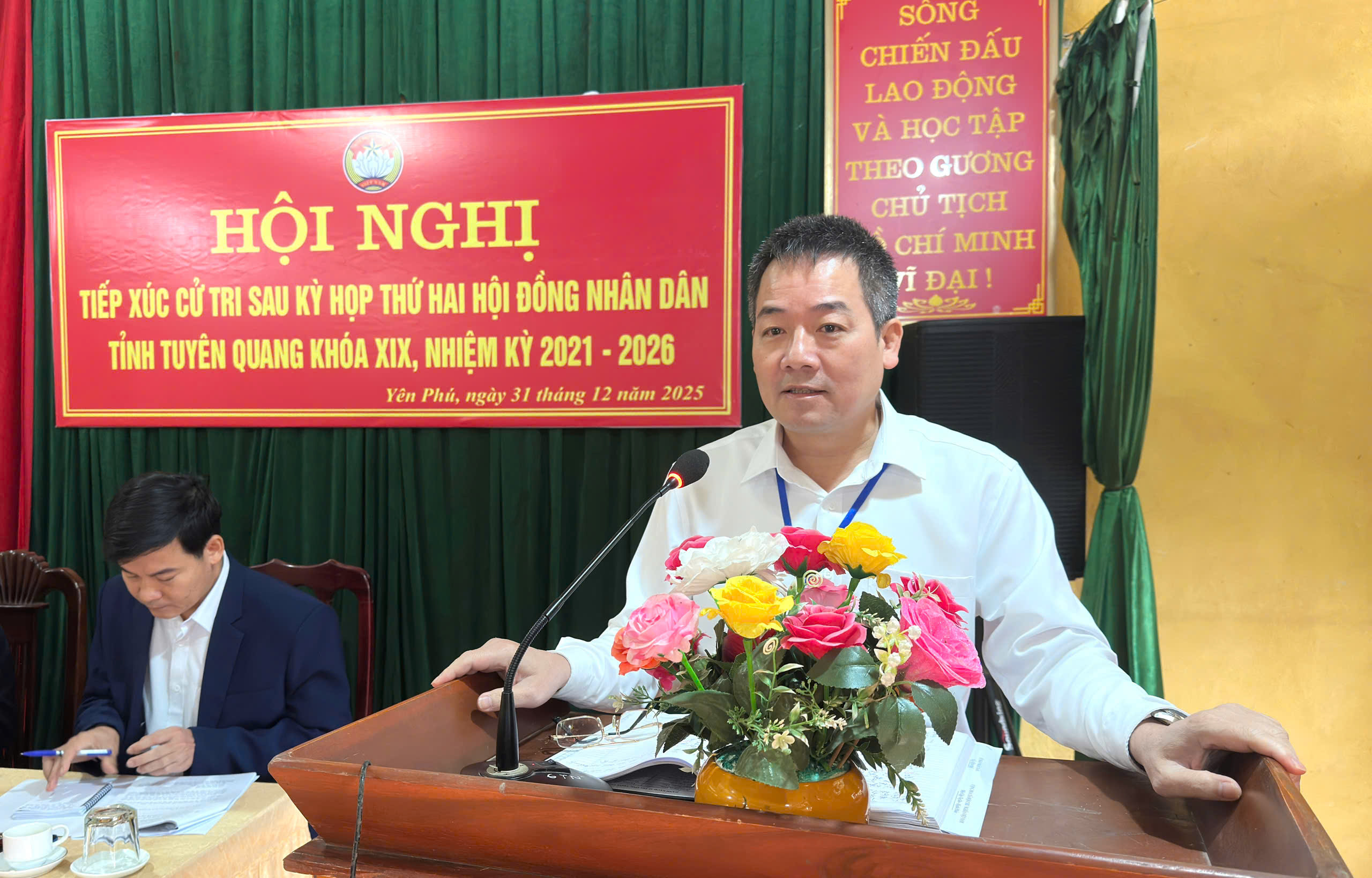 Đồng chí Nguyễn Văn Dưng, Uỷ viên BCH Đảng bộ tỉnh, Giám đốc Sở Dân tộc và Tôn giáo tỉnh Tuyên Quang phát biểu và tiếp thu các ý kiến kiến nghị của cử tri xã Yên Phú