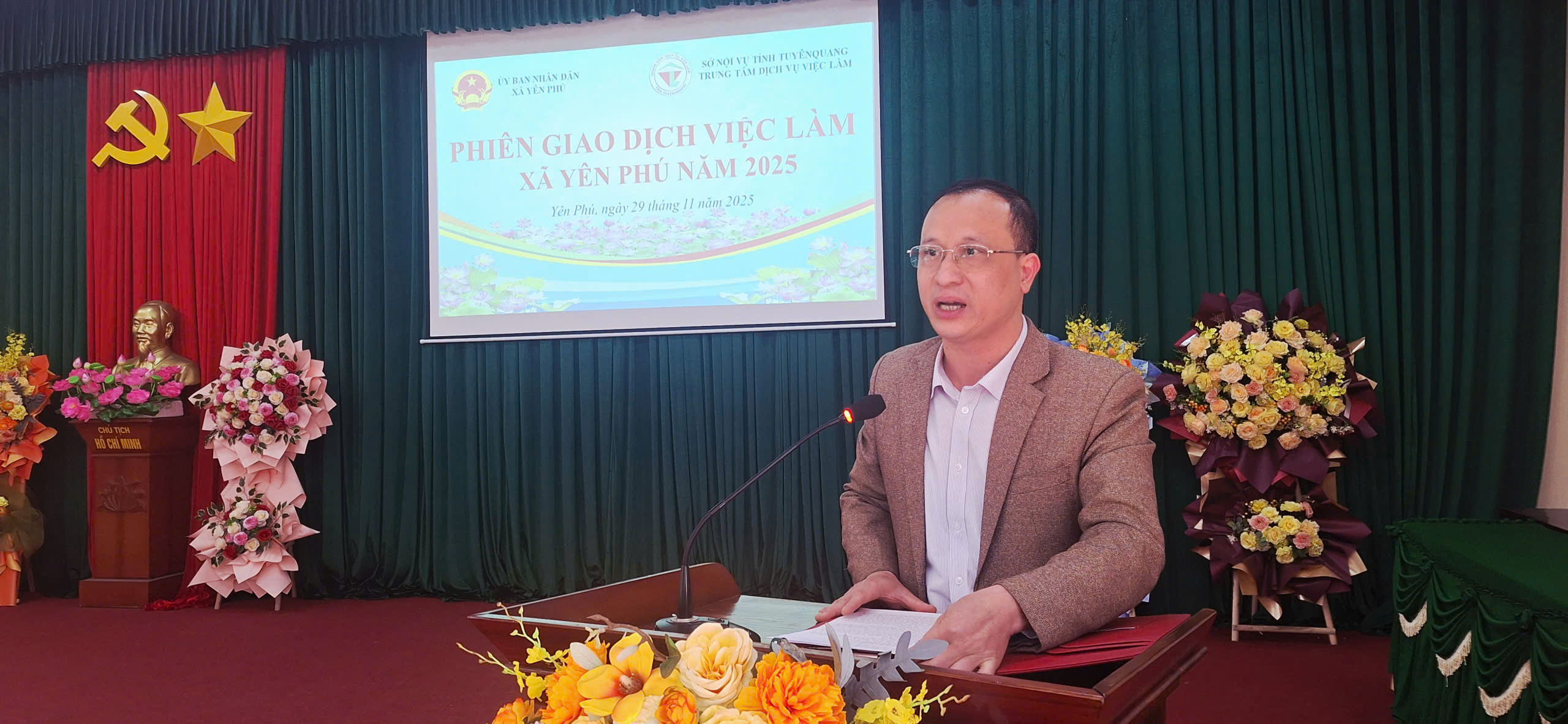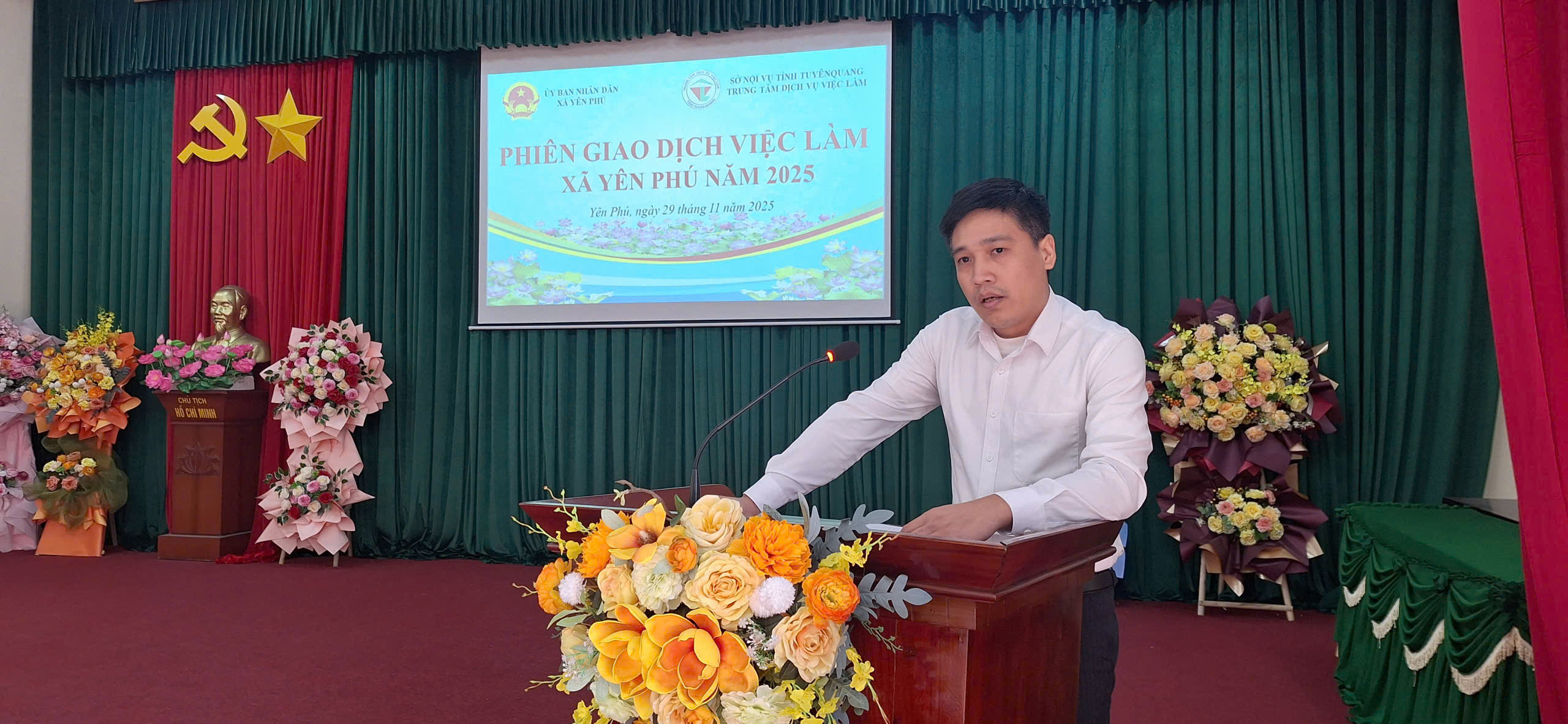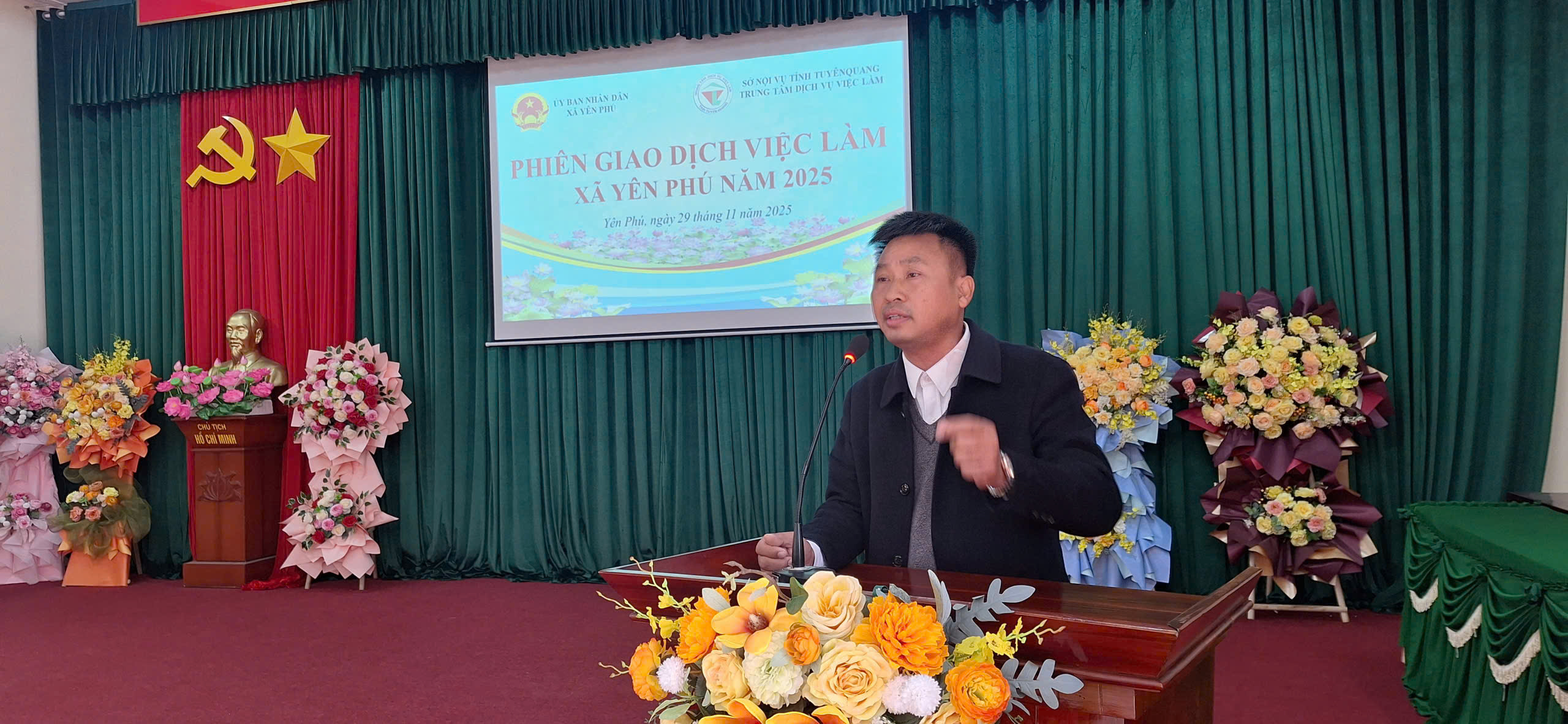 Lãnh đạo Công ty LMK phát biểu tư vấn tại phiên giao dịch việc làm tại xã
