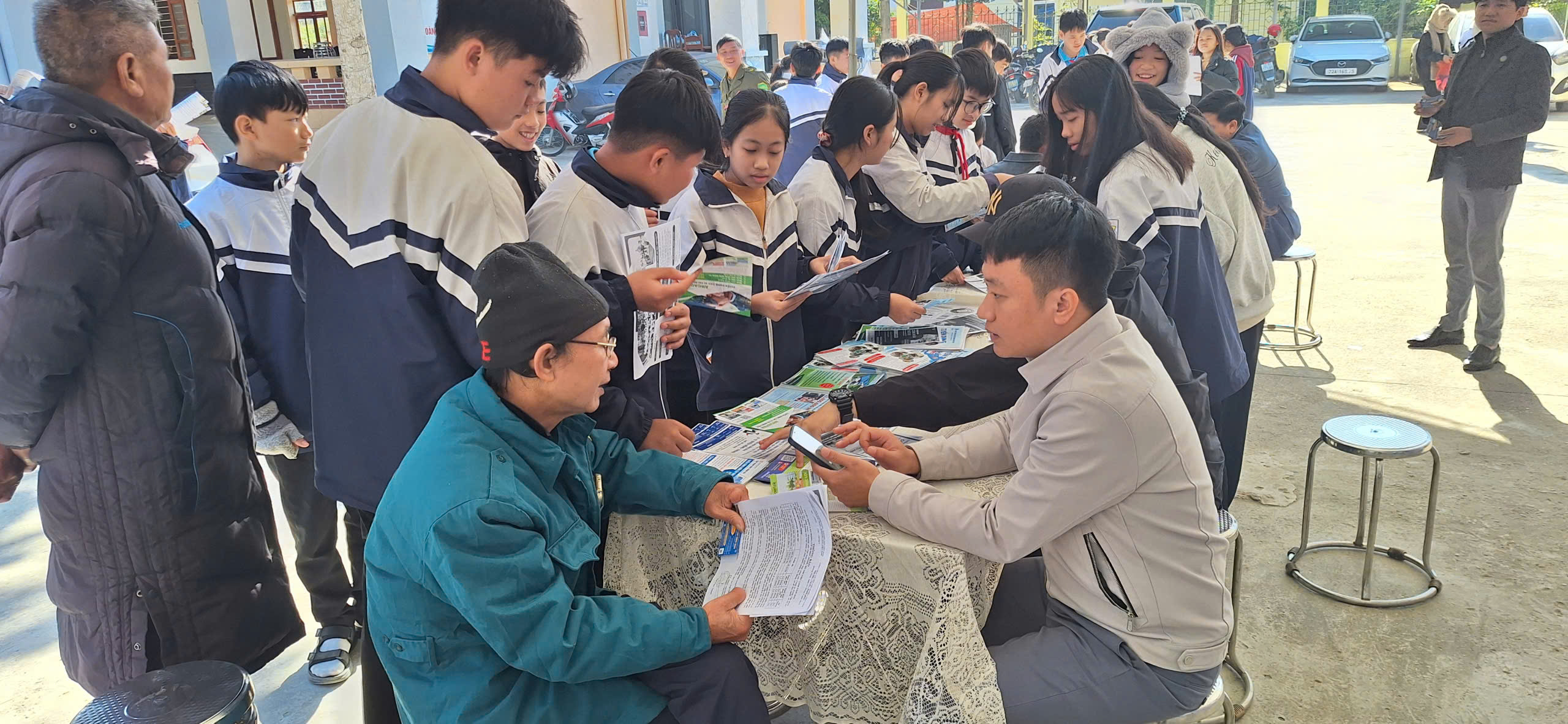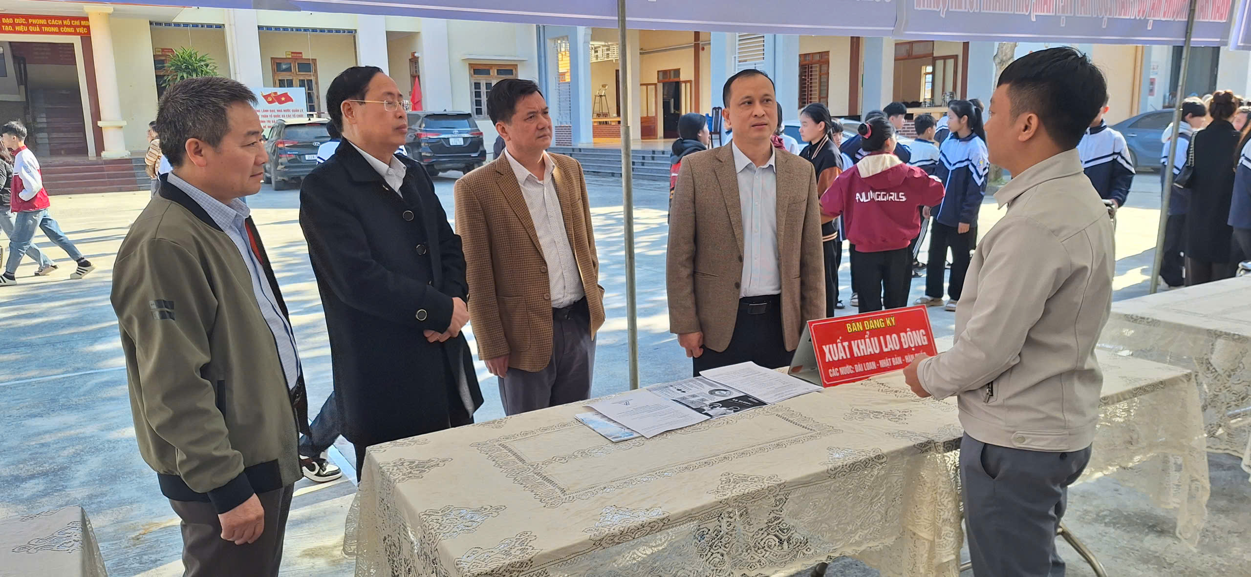 Các đồng chí lãnh đạo xã thăm quan bàn hướng dẫn đăng ký của các công ty tư vấn việc làm tại UBND xã