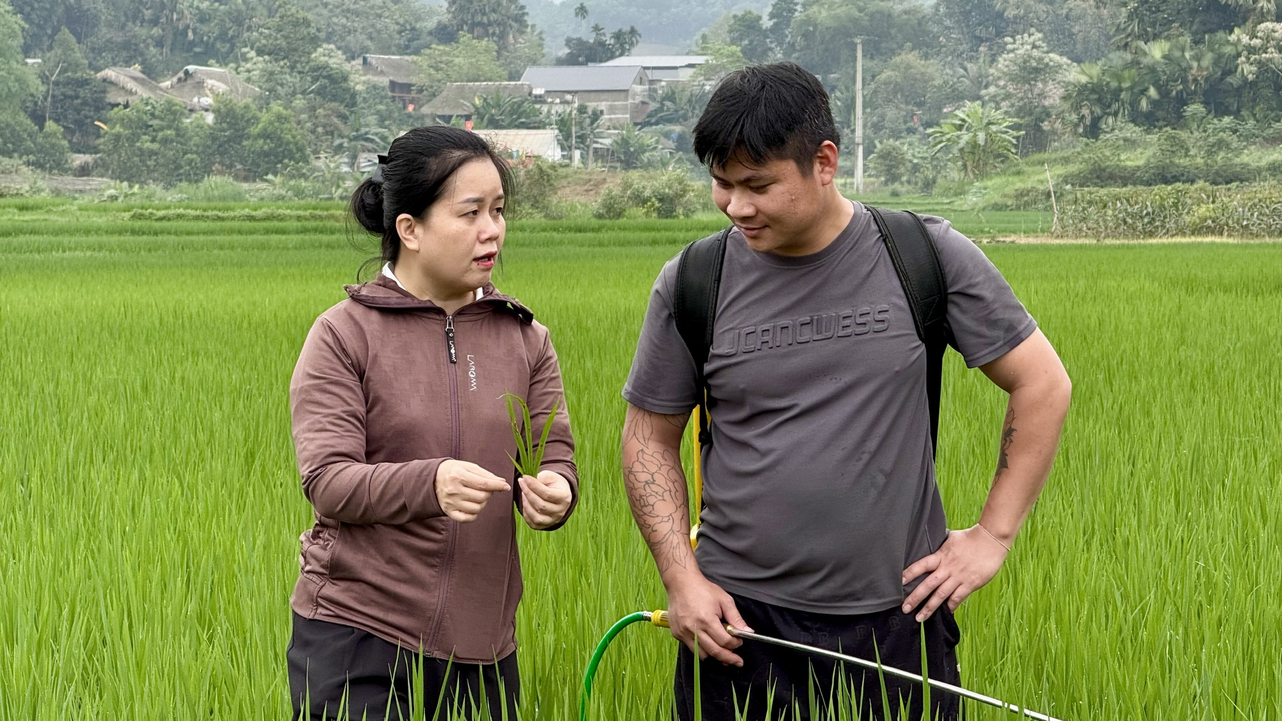 Cán bộ Trạm Bảo vệ và Kiểm dịch thực vật khu vực II cùng Trung tâm DỊch vụ công xã Yên Phú hướng dẫn cho người dân về một số loại sâu, bệnh trên cây lúa
