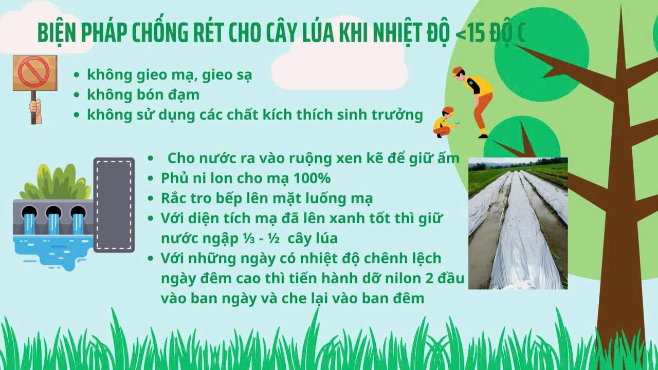 - Đối với diện tích chưa gieo mạ: Tăng cường kiểm tra, giám sát và chỉ đạo chặt chẽ thời điểm ngâm ủ, gieo mạ theo lịch thời vụ, kế hoạch sản xuất và diễn biến của thời tiết; tránh tình trạng để nông dân gieo mạ vào thời gian thời tiết rét đậm, rét hại;