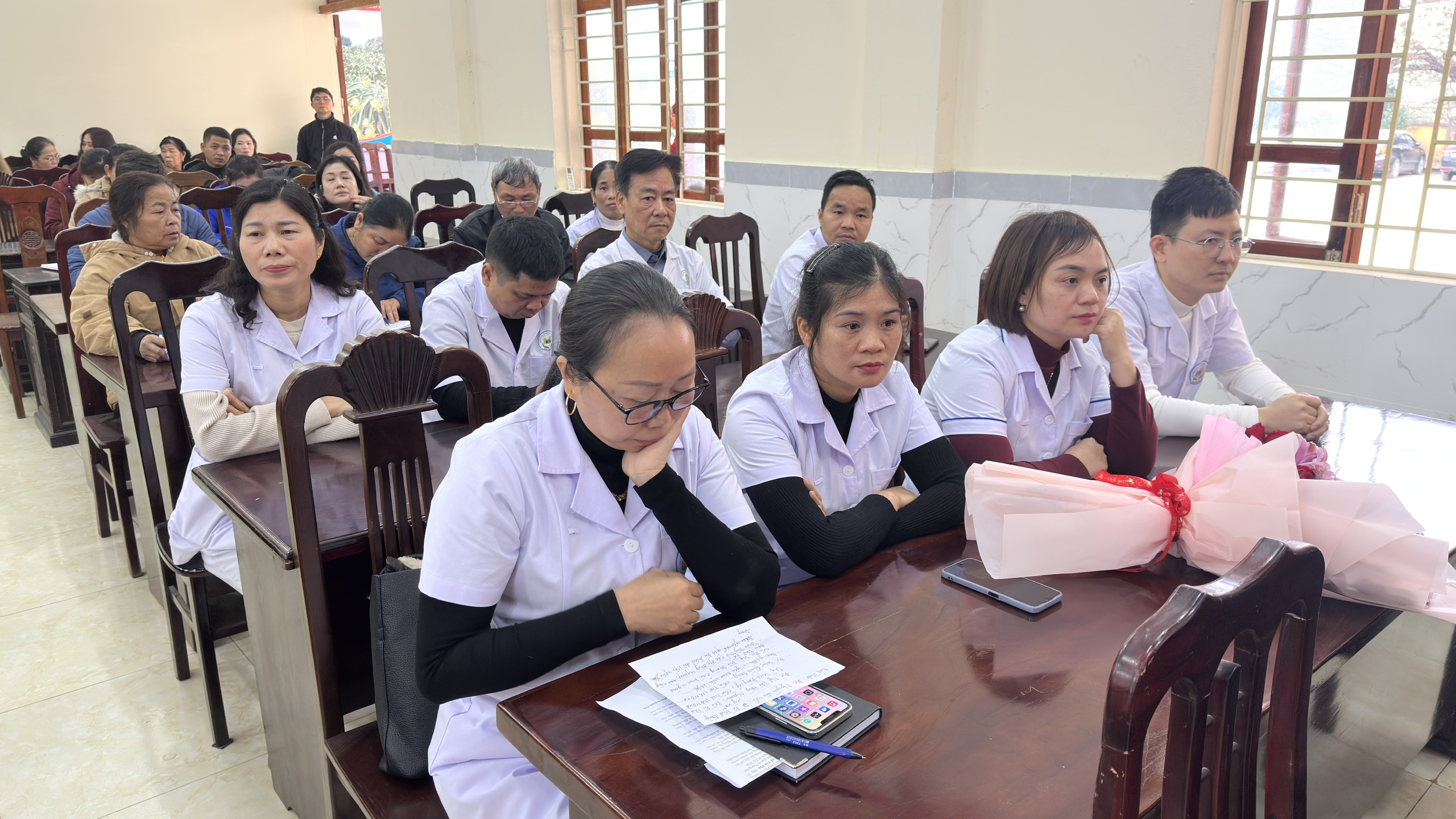 Các đồng chí lãnh đạo xã trao quyết định, chúc mừng các đồng chí cán bộ Trạm Y tế xã